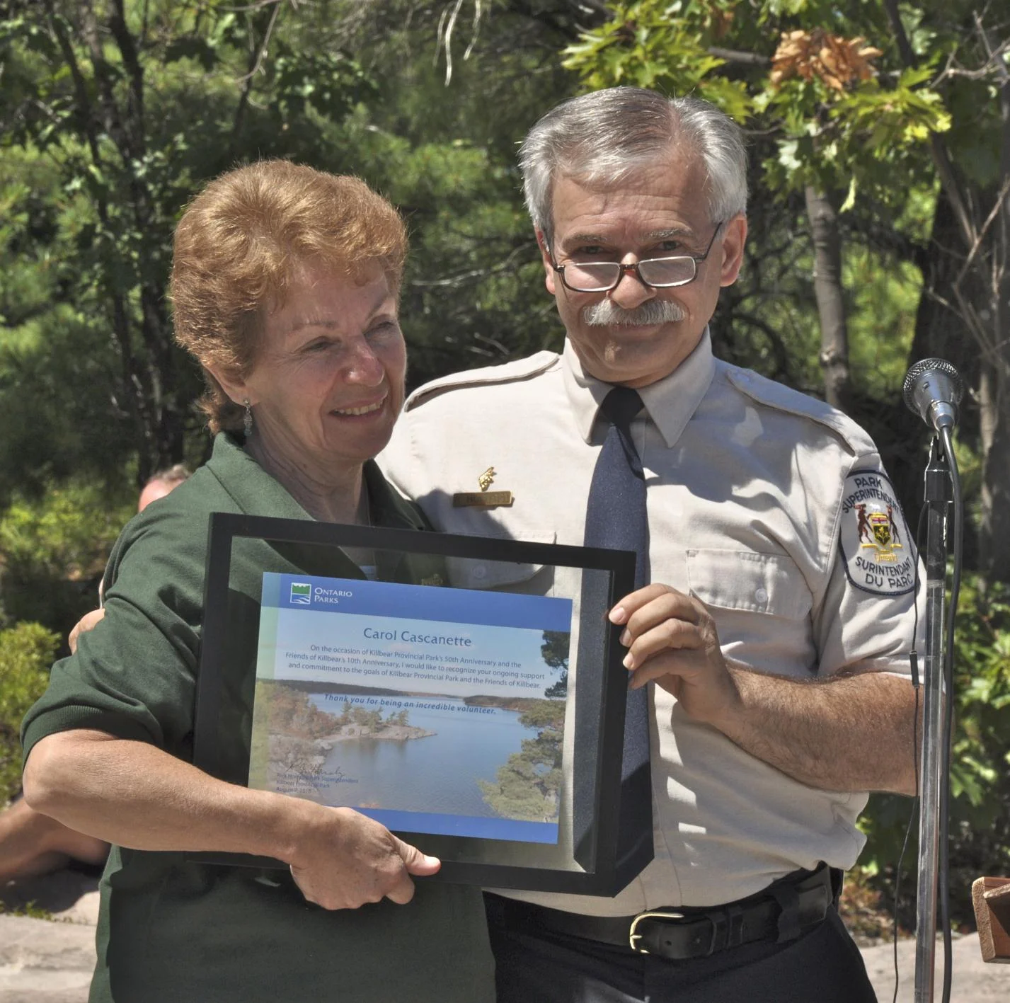 Carol Cascanette receiving award from Superintendent Rick Hornsby at Killbear's 50th Anniversary Party.